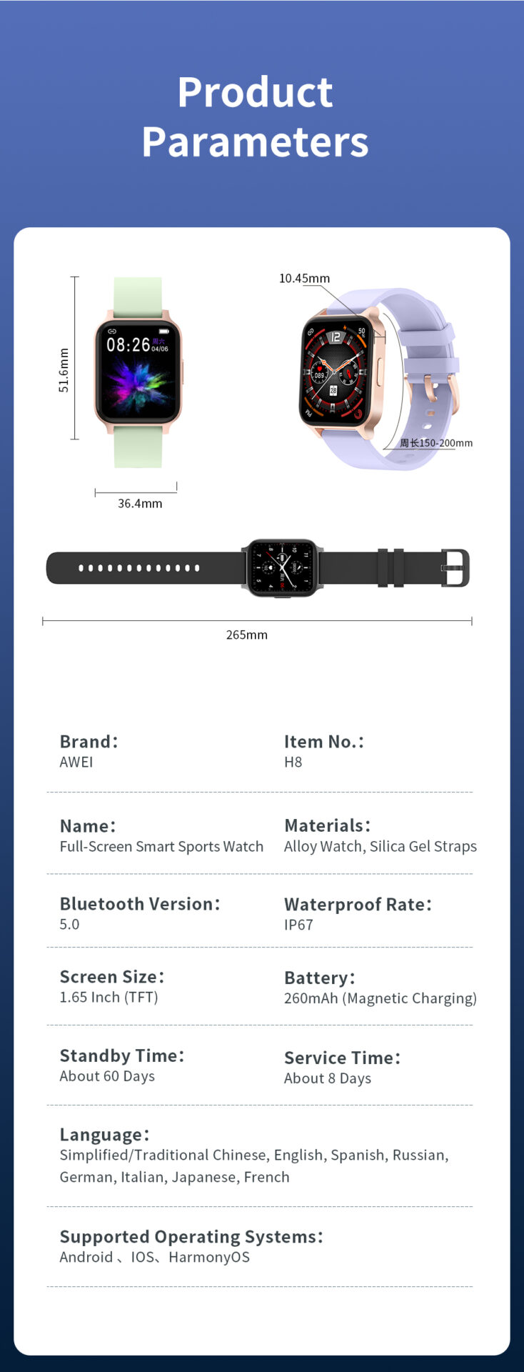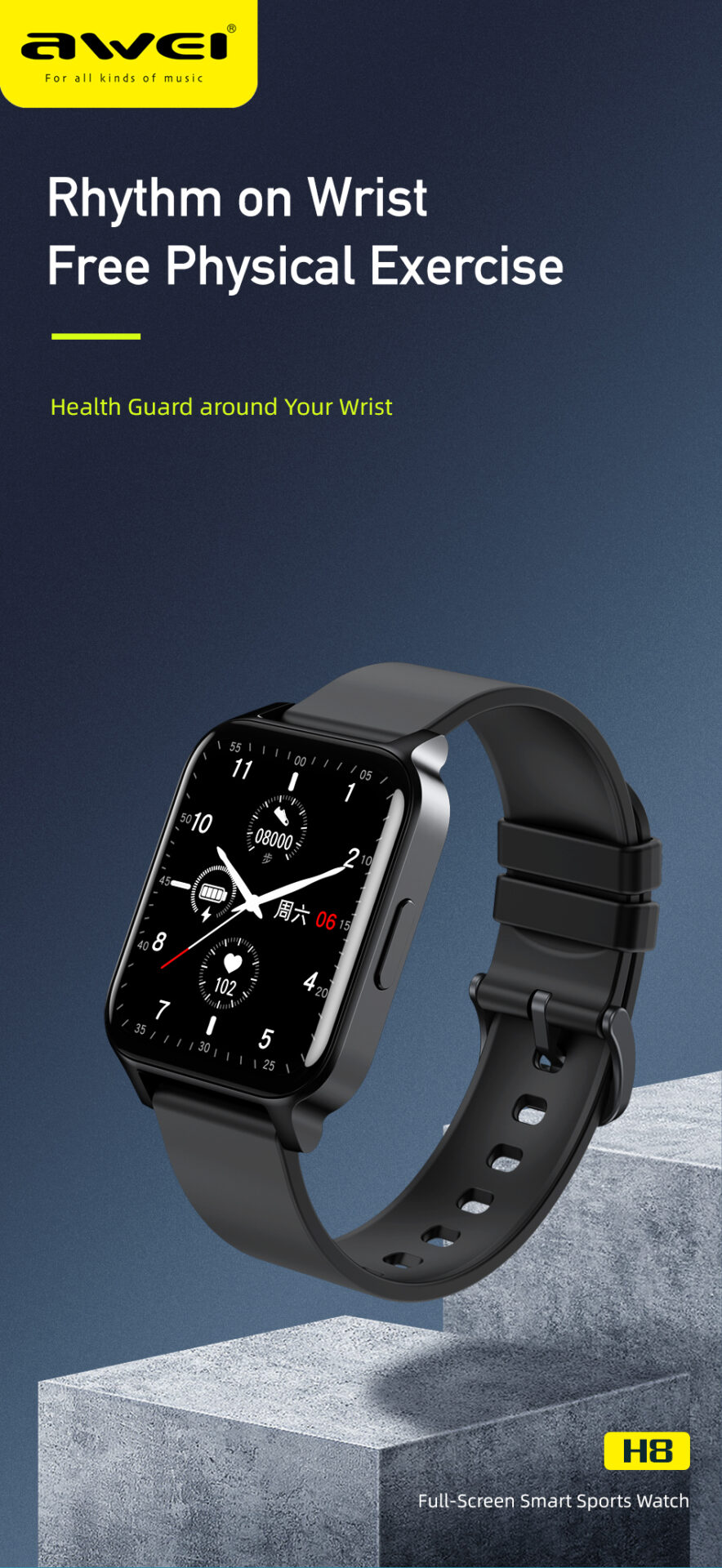 ساعة اصليةوسوار يد رياضي مضادة للماء بتقنية البلوتوث Smart Watch de marque Awei Bluetooth Multifonctionnel H8